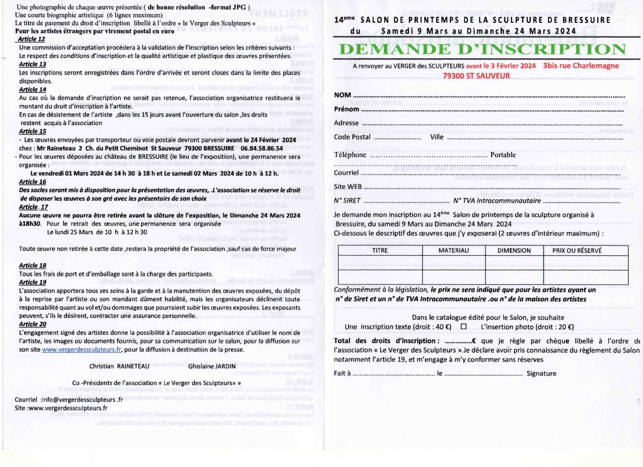 Le salon se tiendra au Château de Bressuire comme pour les années passées, la demande d’inscription est à renvoyer au Verger des Sculpteurs avant le 3 Février 2024 au 3bis rue Charlemagne 79300 St Sauveur de Givre en Mai .